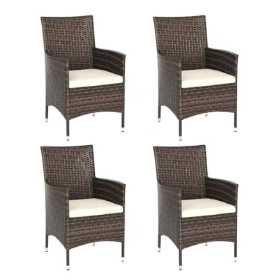 General description These four Outsunny rattan dining chairs are a great complement to your outdoors, whether standing alone or matched with other furniture. The garden dining chairs feature a galvanised metal frame for a tough and fully supportive structure, wrapped in plastic rattan for durability and style. Tall backs and armrests provide support, and each chair includes a cushion for added comfort. Start the season the right way with this stylish four-part set. Technical specifications Colour: Deep Coffee, White Material: Galvanised Metal, PE Rattan, Polyester Chair Size: 60L x 58.5W x 89H cm Seat Size: 45W x 46D x 40H cm Cushion thickness: 5 cm Weight capacity: 120 kg Custom Label: 861-004V72CF Other information Covers are removable and washable Set of four - relax with company or pair with other sets Ideal for garden and outdoor areas, great for pairing with furniture Assembly required