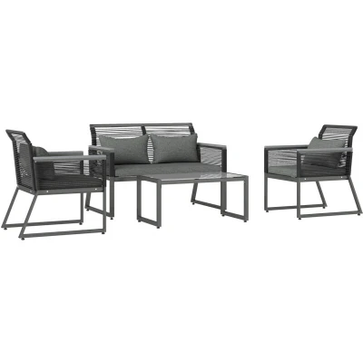 ManoManoGeneral description This four-piece PE rattan outdoor garden furniture set from Outsunny is designed for comfort and style, featuring a modern look that enhances any indoor or outdoor space, including patios, porches, and poolside areas. The set includes two single chairs, a loveseat, and a coffee table, making it perfect for enjoying conversations and meals outdoors. Technical specifications Colour: Charcoal Grey Material: Metal, PE Rattan, Polyester Single Chair Dimension: 59.5W x 68.5D x 79H cm Single Chair Seat Size: 50.5W x 52.5D cm Double Chair Dimension: 116W x 68.5D x 79H cm Double Chair Seat Size: 107W x 52.5D cm Seat Height: 37 cm Tea Table Dimension: 84W x 45D x 38H cm Weight Capacity: 110 kg (single chair), 200 kg (double chair), 30 kg (tea table) Item Label: 867-100V00CG Box quantity: 2 Installation Assembly required Usage Suitable for outdoor parks, patios, and gardens Other information Cushion covers with zippers for easy removal and washing Tempered glass tabletop is