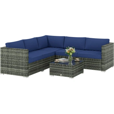 This Outsunny rattan furniture set allows you to rest and relax outdoors. Rust-resistant steel frames make strong pieces, with plastic wicker for a beautiful and tough rattan look. Seat and back cushions on the rattan corner sofa for comfort. Tempered glass tabletop for a sleek look - easy to maintain. Specifications: ● Colour: Grey, Blue ● Material: Steel, PE rattan, Polyester, Tempered glass ● Corner Sofa Dimension: 66W x 66D x 62Hcm ● Loveseat Dimension: 124W x 66D x 62Hcm ● Table Dimension: 58L x 58W x 36Hcm ● Seat Size: 58L x 58Wcm (corner sofa), 116L x 58Wcm (loveseat) ● Seat Height: 33cm ● Seat Cushion Size: 58L x 58W x 8Dcm ● Back Cushion Size: 58L x 30W x 8Dcm (big), 48L x 30W x 8Dcm (small) ● Armrest Size: 8W x 62Hcm ● Weight Capacity: 120kg (per seat), 50kg (table) ● Item Label: 841-158V70BU Just so you know: this item ships and arrives in separate boxes. Delivery times may vary with each box. Box quantity: 3 Features: ● Four-piece corner garden furniture set: two