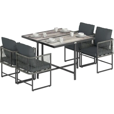 ManoManoTired of a cluttered patio and furniture that can't handle the elements? Your outdoor space feels cramped and you worry about sun damage or a hot plate ruining your table. This Outsunny garden dining set solves it all. The space-saving chairs tuck away neatly, while the robust, heat-resistant DPC tabletop and all-weather frame offer true peace of mind. Reclaim your patio and enjoy every moment outdoors with this versatile cube garden furniture set. Specifications: ● Colour: Black, Grey ● Material: Steel, DPC, PE Rattan, Polyester ● Table Dimension: 108L x 108W x 72.5H cm ● Chair Dimension: 52L x 52W x 66H cm ● Seat Size: 46W x 49D x 35H cm ● Backrest Size: 32L x 42W cm ● Cushion Size: 51L x 47W x 8H cm (Seat), 50L x 47W x 15H cm (Back) ● Rattan Size: Φ5.0 mm ● Maximum Load: 50 kg (Table), 120 kg (Chair) ● Item Label: 84G-938V70GY Just so you know: this item ships and arrives in separate boxes. Delivery times may vary with each box. Box quantity: 2 Features: ● Four chairs tuck neatly