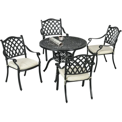 Outsunny 4 Seater Outdoor Dining Set Antique Cast Aluminium Garden Furniture with Cushions Round Table Parasol Hole, Black