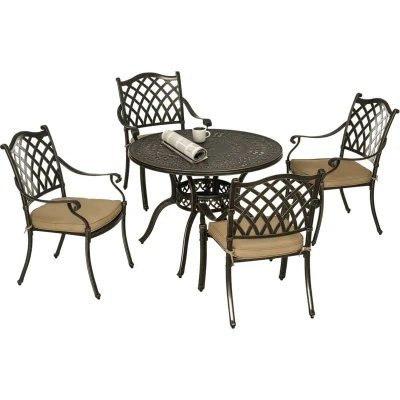 General description Enjoy your outdoor times with family and friends with this vintage charm. This five-piece dining set is perfect for outdoor spaces, both small and large. The floral carved design in a bronze tone finish adds beauty, while the cast aluminium construction ensures long-term use. Each chair comes with a thickly padded seat cushion for comfort, and the table features an umbrella hole to keep you shaded from the sun. Technical specifications Colour: Bronze, Khaki Material: Cast Aluminium, Polyester, Sponge Table Dimension: Φ100 x 72H cm Chair Dimension: 63W x 67D x 91H cm Seat Dimension: 42W x 45D cm Seat Height: 38 cm Cushion Size: 46L x 46W x 5D cm Armrest Height: 62 cm Backrest Height: 43L x 52W cm Weight Capacity: (table) 60 kg, (chair) 120 kg Item Label: 84B-786 Box quantity: 3 Installation Assembly is required for this dining set. Usage This dining set is perfect for outdoor spaces such as gardens, patios, and balconies. The contoured shape and curved armrests