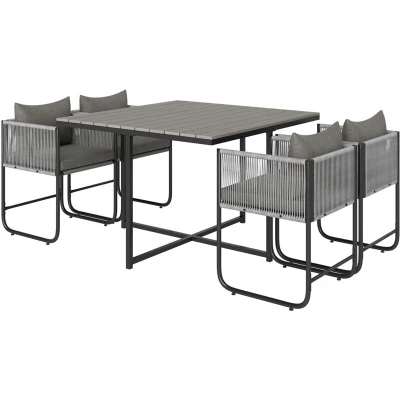 An inviting setting for all great for garden and other outdoor areas: this Outsunny five-piece garden set. It comes with four armchairs and a square dining table - room for you to sit down and gather round together. Solid metal for a strong frame, with plastic wicker for the chairs to offer double the durability the fringed design creates a very cool look. The wood-effect plastic tabletop is tough and easy to clean. Both chairs and stools come with padded cushions for comfort. Specifications: ● Colour: Black, Grey ● Material: Steel, PE Rattan, Polyester, Plastic ● Chair dimension: 50.5W x 49.5D x 67H cm ● Table dimension: 110L x 110W x 75H cm ● Seat size: 48W x 43D cm ● Seat height(without cushion): 42cm ● Weight capacity: 120kg(chair), 70kg(table) ● Certification: EN581 ● Item label: 861-061V71GY Just so you know: this item ships and arrives in separate boxes. Delivery times may vary with each box. Box quantity: 2 Features: ● Powder coated metal frames form each piece: strong and