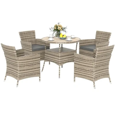 Outsunny 4 Seater Rattan Dining Set with Cushions, Double Layer Table Wood like Slat Top, PE Garden Furniture Set, Outdoor and Chairs for Patio, Balcony, Lawn, Grey