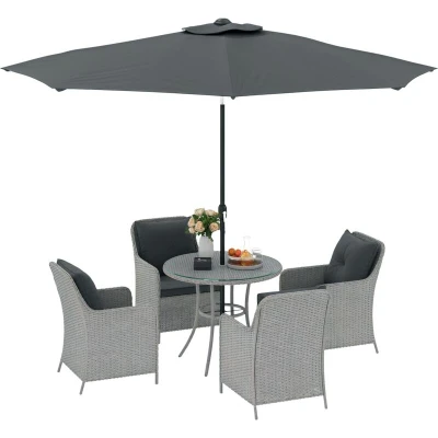 Enjoy stylish outdoor dining, thanks to this Outsunny rattan table and chairs set. This six-piece ensemble includes four armchairs, a round table and parasol umbrella for shade. Each chair comes with a seat and back cushion: relax and dine comfortably. Stylish outdoor dining table and chairs for you and company. Specifications: ● Colour: Light Grey, Grey ● Material: Steel, PE Rattan, Polyester, Tempered Glass ● Chair Size: 59W x 72D x 84H cm ● Dining Table Size: Ф90 x 75H cm ● Umbrella Size: Ф270 x 235H cm ● Umbrella Hole Size: Ф4.2 cm ● Seat Size: 50W x 51D cm ● Seat Height (without cushion): 40 cm ● Backrest Size: 50L x 50W x 48H cm ● Seat Cushion Size: 51W x 51D x 5H cm ● Weight Capacity: 120 kg (chair), 70 kg (table) ● Item Label: 861-086V70LG Just so you know: this item ships and arrives in separate boxes. Delivery times may vary with each box. Box quantity: 4 Features: ● Six-piece rattan garden dining set: comes with round table, garden umbrella and four dining chairs ● Tempered