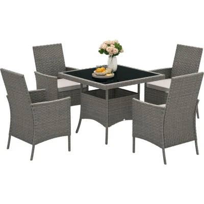 Enjoy alfresco dining with the Outsunny rattan dining set, a charming addition to any outdoor space. This 5-piece garden dining set, featuring four cosy chairs with washable cushions and a sleek table, promises comfort and style. Crafted from all weather double-strand half-round PE rattan with a robust steel frame, it's designed to weather the elements, making it a staple for any garden table and chairs collection. Specifications: ● Colour: Grey ● Material: PE Rattan, Steel, Fibre cloth, Tempered glass, 3D vertical cotton ● Table: 90L x 90W x 74H cm ● Chair: 58W x 59D x 96H cm ● Seat Size: 46W x 44D x 42H cm ● Backrest: 57L x 46W x 54H cm ● Cushion: 46L x 44W x 5D cm ● Item Label: 861-113V70GY Just so you know: this item ships and arrives in separate boxes. Delivery times may vary with each box. Box quantity: 2 Features: ● Five-piece set suitable for family meals and social gatherings ● Includes four chairs and a table for complete dining solutions ● Removable, washable cushions