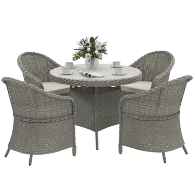 AmazonFive-piece garden dining set: The outdoor garden furniture set comes with four dining armchairs and a matching round dining table. A way to bring family/friends together in your garden and outdoor areas. Tempered glass-top table, with parasol hole: A place to hold your garden umbrella. Safe, strong surface top for you to eat and drink from, adds a sleek look to the outdoor dining set. Steel wrapped in stylish wicker: Powder coated frame for strong support, these outdoor table and chairs are wrapped in grey plastic wicker. Double be structure, double the strength. Keep protected with a cover for extended use. Comfortable: 10cm thick padded seat cushions of the rattan garden furniture set keep you relaxed as you sit. Ergonomic features of chair include the high back and armrests. Cushion covers are removable and washable. Dimensions: Chair: 69W x 63D x 82H cm. Table: Ф102 x 73H cm. Umbrella hole: Ф5 cm. Maximum load: 160 kg (chair), 50 kg (table). Assembly required.
