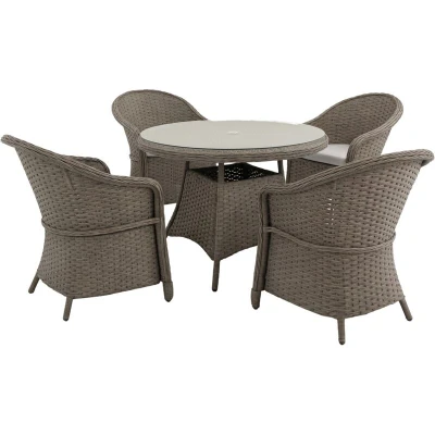 General description Gathering guests around this season and beyond is stylish with the Outsunny Rattan Dining Set. This set features a sleek glass-top table paired with on-trend grey rattan, making it a welcome addition to your garden and outdoor areas. It includes four armrest chairs, each equipped with padded seat cushions for comfort, high backs, and armrests for support. The table also has a middle hole designed for a parasol, providing a shaded area for relaxation. Technical specifications Colour: Mixed Grey, Sand Brown Material: Steel, PE Rattan, Polyester Dining Table Dimension: Ф102 x 73H cm Chair Dimension: 69W x 63D x 82H cm Seat Size: 46W x 47D cm Seat Height (without cushion): 43 cm Cushion Thickness: 5 cm Weight Capacity: 160 kg (chair), 50 kg (table) Item Label: 861-045 Box quantity: 2 Installation Assembly is required for this dining set. Usage Enjoy outdoor dining and gatherings with comfort and style, utilizing the umbrella hole for added shade. Other information