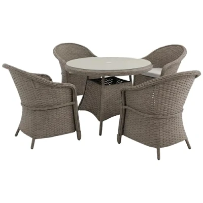 AmazonFive-piece garden dining set: The outdoor garden furniture set comes with four dining armchairs and a matching round dining table. A way to bring family/friends together in your garden and outdoor areas. Tempered glass-top table, with parasol hole: A place to hold your garden umbrella. Safe, strong surface top for you to eat and drink from, adds a sleek look to the outdoor dining set. Steel wrapped in stylish wicker: Powder coated frame for strong support, these outdoor table and chairs are wrapped in grey plastic wicker. Double be structure, double the strength. Keep protected with a cover for extended use. Comfortable: 10cm thick padded seat cushions of the rattan garden furniture set keep you relaxed as you sit. Ergonomic features of chair include the high back and armrests. Cushion covers are removable and washable. Dimensions: Chair: 69W x 63D x 82H cm. Table: Ф102 x 73H cm. Umbrella hole: Ф5 cm. Maximum load: 160 kg (chair), 50 kg (table). Assembly required.