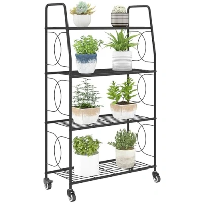 ManoManoOptimize your space with the Outsunny 4-tier plant stand. Four spacious shelves (63.5 x 29 cm each) let you grow more plants in a compact footprint, great for balconies, patios, or indoor corners. Smooth PU wheels with locks and built-in handles make moving and positioning effortless, while rust-resistant steel ensures durability and easy maintenance. Versatile and stylish, it's suitable for plants, books, or decorative items anywhere in your home. Specifications: ● Colour: Black ● Material: Metal ● Overall Dimensions: 67L x 29W x 114H cm ● Shelf Dimensions: 63.5L x 29W cm ● Bottom to Floor Height: 10 cm ● Weight Capacity: 90 kg ● Item Label: 84H-520V00BK Features: ● Four spacious tiers (63.5 x 29 cm each) maximise vertical space for more plants in a compact area ● Smooth PU wheels with two lockable ones and built-in handles make moving and positioning easy ● Rust-resistant powder-coated steel frame keeps your plants elevated, dry and protected ● Four adjustable foot pads ensures