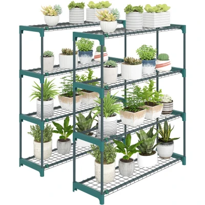 ManoManoKeep your plants organized and thriving with the Outsunny set of 2 4-tier plant stand. Designed with solid steel pipes, wire shelves, and PP connectors, it offers stable support for multiple pots while maximizing vertical space. Each tier provides lots of room for sunlight and airflow, helping plants grow healthier. The moisture-resistant, easy-to-clean frame ensures long-lasting use, and its tool-free assembly makes setup quick and effortless. Great for balconies, patios, and indoor gardening. Specifications: ● Colour: Dark Green ● Materials: Steel, Plastic ● Overall Dimensions: 90L x 28W x 104H cm ● Shelf Dimensions: 82L x 24.5W x 32.5H cm ● Weight Capacity: 10 kg ● Item Label: 84H-558V00DG Features: ● Set of 2 plant stand offer more space for your plants ● 4-tier design supports multiple plants efficiently ● Solid steel pipes and wire shelves provide stable support ● Each tier allows ample sunlight and airflow for healthier plant growth ● Moisture-resistant and easy-to-clean