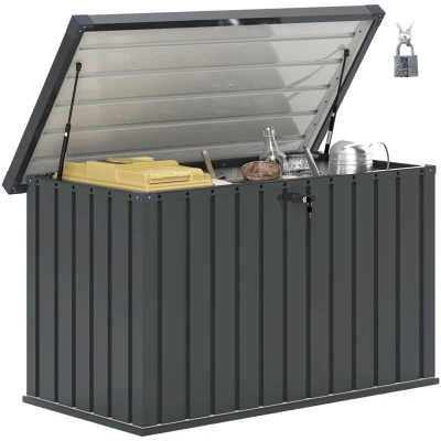 General description With a 400 L capacity, this Outsunny outdoor storage box is spacious enough for soft furnishings, garden accessories, and more. The galvanised steel structure makes this a tough, protective piece, ensuring durability and longevity. It features a safe open, soft close lid for safety, with an overlapping edge to prevent water from seeping through. For added security, the box comes with a built-in lock and two keys. Technical specifications Colour: Dark Grey Material: Galvanised Steel Overall Dimension: 124W x 66D x 72H cm Internal Dimension: 112W x 54.5D x 65.5H cm Max. Height of Lid: 124 cm Lid Panel Thickness: 0.45 mm Wall Thickness: 0.25 mm Weight Capacity (inner): 40 kg Weight Capacity (top): 50 kg Item Label: 84G-479V00CG Usage Ideal for storing furnishings, garden tools, and outdoor accessories. Gas-lift lid opens and closes gently for safety. Designed to withstand outdoor conditions with its protective features.