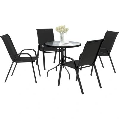 Simple, stylish outdoor garden furniture for relaxing or dining with this Outsunny patio set. It comes with a round table and four chairs to sit outdoors with company the chairs are stackable to save space when not being use. Powder coated steel frames mean strong, tough cores on the patio table and chairs, suitable for outdoor use. Balcony furniture set is complete with Φ43mm hole in the table to hold a parasol securely in place. Specifications: ● Colour: Black ● Material: Steel, Texteline (100% Polyester), Tempered Glass ● Table Dimension: Φ80 x 71H cm ● Armchair Dimension: 54W x 71D x 93H cm ● Seat Size: 44.5W x 45D cm ● Seat to Floor Height: 43 cm ● Back Size: 44.5W x 58H cm ● Parasol Hole Size: Φ43mm ● Weight Capacity: 120 kg (chair), 50 kg (table) ● Item Label: 84G-683V00BK ● Note: Use a furniture cover to extend the service life of this set Just so you know: this item ships and arrives in separate boxes. Delivery times may vary with each box. Box quantity: 2 Features: ●