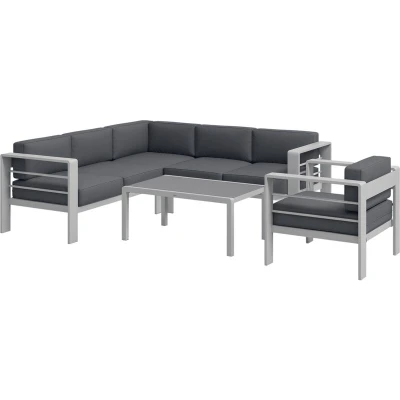 General description Simple and sleek, finished with total comfort - this Outsunny aluminium garden set ticks all the right boxes. The metal frames ensure strength and suitability for outdoor use, while the padded cushions on the seats and back provide a relaxing experience. This patio furniture set includes five pieces: two two-seater sofas, a corner chair, an armchair, and a rectangular table, allowing you to set it up in a shape that suits your space. The table features a glass top for a sleek look. Technical specifications Colour: Light Grey, Dark Grey Materials: Aluminium, Polyester, Tempered Glass Chair Dimension: 81W x 70D x 62.5H cm Loveseat Dimension: 130W x 70D x 62.5H cm Coffee Table Dimension: 96L x 60W x 41H cm Armchair Seat Size: 60W x 68D x 25H cm Corner Seat Size: 68W x 68D x 25H cm Loveseat Seat Size: 120W x 68D x 25H cm Cushion Thickness: 13cm (seat cushion), 12cm (back cushion) Weight Capacity: 260kg (loveseat), 130kg (chair), 50kg (table) Item Label: 84G-462V00CG
