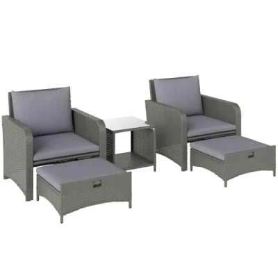 ManoManoGeneral description Transform your garden into a cosy retreat with the Outsunny Wicker Patio Conversation Set. This five-piece outdoor garden furniture ensemble includes two armchairs, two versatile footstools, and a chic two-tier coffee table, providing a perfect setting for leisurely afternoons. Enjoy wide seating with thick cushions for added comfort, and easily slide the ottomans under the chairs when not in use to save space and keep your outdoor area neat and organized. This set is ideal for any garden, conservatory, or balcony setup. Technical specifications Colour: Grey Materials: Steel, PE Rattan, Polyester, Tempered Glass Armchair Size: 70W x 70D x 75H cm Ottoman Size: 57.5W x 52D x 27.5H cm Table Size: 45W x 45D x 43H cm Seat Size: 58W x 58D x 30H cm Back Size: 58W x 45H cm Cushion Thickness: 5 cm (seat/footstool), 17 cm (back) Armrest Height to Floor: 56 cm Weight Capacity: 160 kg (per seat), 50 kg (table) Item Label: 860-349V70GY Usage Ottomans can be used as footstools,