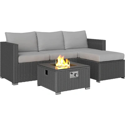 Outsunny 5 Piece Rattan Garden Furniture Set with Gas Fire Pit Table, 4 Seater Outdoor Sectional Sofa Footstool and Removable Cushions, Modular Combination, Grey