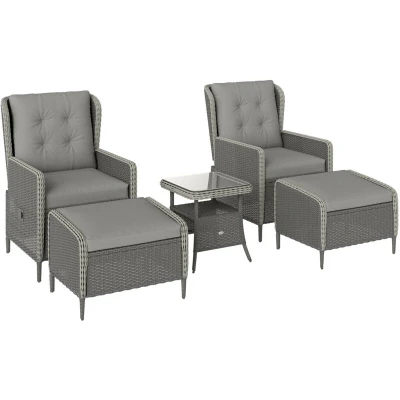 Outsunny 5 Piece Rattan Garden Furniture Set with Recliner Chairs, Wicker Patio Conversation Footstools, 2 Tier Glass Top Coffee Table, Cushions for Outdoor, Balcony, Porch, Charcoal Grey