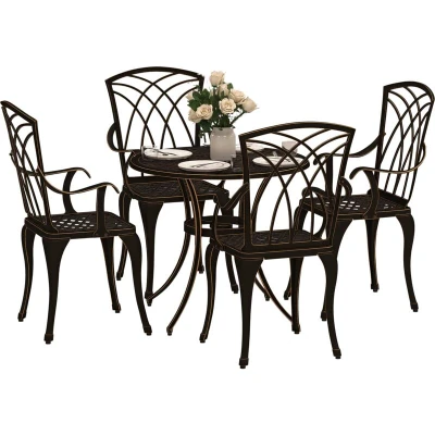 General description This five-piece outdoor garden furniture set from Outsunny provides an ideal spot for dining and relaxation. It includes four chairs and a matching round table, all constructed from robust cast aluminium to ensure durability. The table features a middle hole for securely placing a sun parasol, while the chairs have an attractive cut-out design on the back. Technical specifications Colour: Bronze Tone Material: Cast Aluminium Table Dimension: Ф85 x 73H cm Chair Dimension: 52W x 51.5D x 89H cm Seat Dimension: 41W x 38D x 43H cm Umbrella Hole: Φ50 mm Weight Capacity: 70 kg (table), 160 kg (chair) Item Label: 84B-346V00TN Box quantity: 2 Usage Ideal for flats and apartments with balconies Perfect for small outdoor areas Other information Assembly required Adjustable, non-slip feet for balance and floor protection