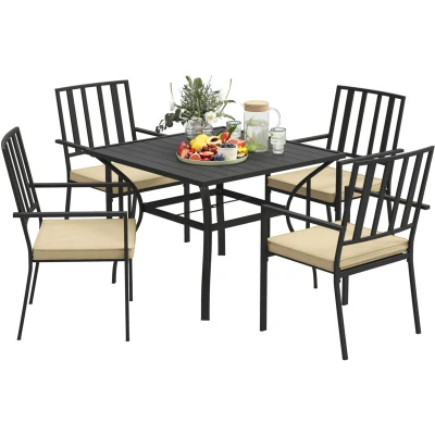 General description Make it minimal for outdoor catch-ups with this Outsunny garden dining set. Made from metal, the set includes four stackable cushioned chairs and a square dining table, providing ample space for you and your company to gather. The table features a Φ50mm round hole in the center, designed to hold a Φ38-Φ48mm parasol pole, allowing you to stay shaded while you relax. Technical specifications Colour: Black, Beige Material: Galvanised Steel, Polyester, Sponge Table dimensions: 71H x 94L x 94W cm Chair dimensions: 89H x 57W x 58D cm Seat dimensions: 49W x 43.5D x 42H cm Backrest dimensions: 49L x 47.5W cm Stackable dimensions (four chairs): 98H x 57W x 67D cm Weight capacity: 120 kg (chair), 50 kg (table) Item label: 84G-280V70BK Installation Assembly is required for this dining set. Usage The outdoor dining set is perfect for gatherings, featuring soft seat cushions for comfort and stackable chairs to save space when not in use. The removable and washable covers make