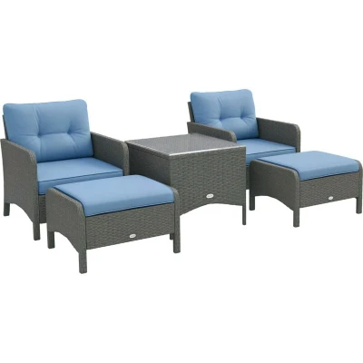 Outsunny 5 Pieces PE Rattan Garden Furniture Set with 10cm Thick Padded Cushions, Wicker Weave Outdoor Seating Chairs 2 Armchairs, Stools, Glass Top Table, Blue