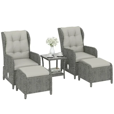 ManoManoThis Outsunny garden furniture set is a great addition to enjoy the summers. Made of lightweight aluminium frame and half-round PE rattan, in good construction which will last for years to come. It comes with thick padded cushions to offer superior comfort. The side table is topped with tempered glass for stylish and easy to clean. Backrest with 90°-135° angle adjustable provide comfortable lounging experience, enjoy your outdoors summer to the fullest with these bistro table and chairs, Specifications: ● Colour: Cream White, Grey ● Material: Aluminium, PE Rattan, Polyester, PP ● Chair Dimension: 59W x 77D x 100H cm ● Footstool Dimension: 53W x 50D x 42H cm ● Side Table Dimension: 44L x 44W x 47H cm ● Seat Size: 51W x 58D cm ● Seat Height: 34 cm ● Weight Capacity: 120 kg (per seat/footstool), 30 kg (table) ● Item Label: 860-264V70CW Features: ● 5 pieces rattan furniture set includes 2 reclining chairs, 2 footstools and 1 table ● Made from half-round PE rattan wicker and lightweight