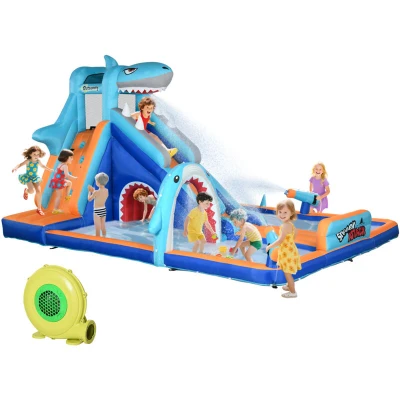 General description Create your very own water park with the Outsunny 6 in 1 Kids Bouncy Castle, where fun is unlimited. This bouncy castle offers a variety of activities to keep children entertained, making it nearly impossible to get bored. It is spacious enough to accommodate up to four children at once, making it perfect for playdates and parties. Designed for outdoor use, the castle is secured to the ground with ground stakes, ensuring safety during play. The included electric air blower allows for quick inflation, transforming your space into a fun-packed playground in just a few minutes. Technical specifications Colour: Multicoloured Material: 420D+840D Oxford fabric Overall dimensions: 240H x 440L x 350W cm Pool dimensions: 350L x 330W cm Slide dimensions: 140H x 250L x 50W cm Climbing wall dimensions: 125H x 50W cm Water gun dimensions: 40H x 50L cm Doorway dimensions: 70H x 60W cm Arch dimensions: 95H x 75W cm Recommended age: 3-8 years Weight capacity: 120 kg Blower power: