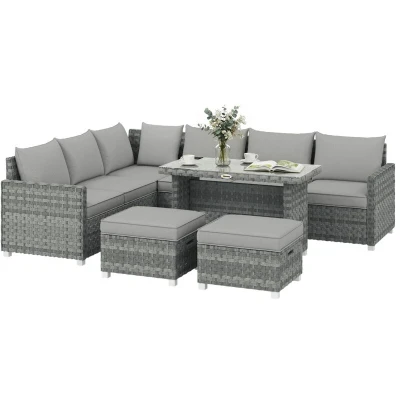 Turn everyday outdoor moments into something special with the Outsunny six-piece L-shaped rattan garden furniture set. With three two-seater sofas, two footstools and a sleek dining table, there's comfortable space for up to six people to stretch out and unwind. Soft, thick cushions invite you to sit back longer, while the woven rattan finish and tempered glass tabletop add a calm, stylish touch—great for slow mornings, sunny afternoons, or laid-back evenings together. Specifications: ● Colour: Grey ● Material: Metal, PE Rattan, Polyester, Tempered Glass, Cotton ● Side Sofa Dimension: 122W x 68D x 70H cm ● Corner Sofa Dimension: 124W x 68D x 70H cm ● Table Dimension: 109L x 54W x 66H cm ● Footstool Dimension: 55.5L x 49W x 30H cm ● Single Seat Size: 58W x 58D cm ● Seat Height: 31 cm ● Cushion Thickness: 8 cm (seat), 15 cm (back) ● Weight Capacity: 120 kg (per seat), 70 kg (table) ● Item Label: 860-443V70GY Just so you know: this item ships and arrives in separate boxes. Delivery times