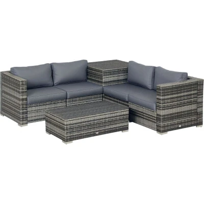 Outsunny 6 Pieces Rattan Garden Furniture Set, 4 Seater Wicker Corner Sofa Set with 2 Storage Tables and Loveseats, Outdoor Conversation Cushions for Conservatory, Patio, Grey
