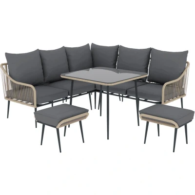 Outsunny 6 Pieces Rattan Garden Furniture Set, Corner Sofa with Thickened Cushions, Outdoor Dining Set Glass Top Table, Loveseats and Footstools for Conservatory, Light Brown