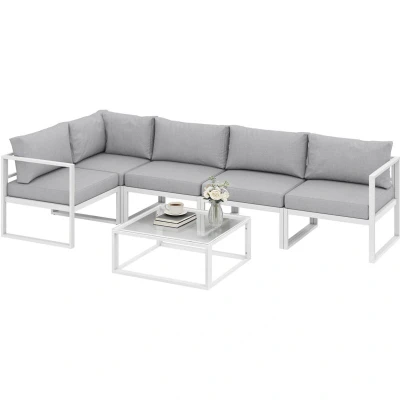 ManoManoStruggling to find outdoor seating that fits every occasion? Heavy, rigid garden furniture can make your patio feel limiting and uncomfortable for guests. This Outsunny garden sofa set offers a solution. Its lightweight, modular design easily transforms for any gathering, while deep, plush cushions provide exceptional comfort. Effortlessly create the inviting, versatile social space you've envisioned, ensuring every moment outdoors is spent in complete relaxation and style. Specifications: ● Colour: White, Light Grey ● Material: Aluminium, Polyester, Tempered Glass ● Overall Dimension: 267L x 135W x 63H cm ● Corner Sofa : 65W x 65D x 63H cm ● Coffee Table : 75L x 70W x 30H cm ● Seat Size: 65W x 65D x 30H cm ● Seat Cushion: 65W x 65D x 10H cm ● Large Back Cushion: 65W x 35D cm ● Small Back Cushion: 50W x 35D cm ● Maximum Load: 160 kg (Single Sofa), 30 kg (Table) ● Item Label: 860-048V71LG Just so you know: this item ships and arrives in separate boxes. Delivery times may vary with each