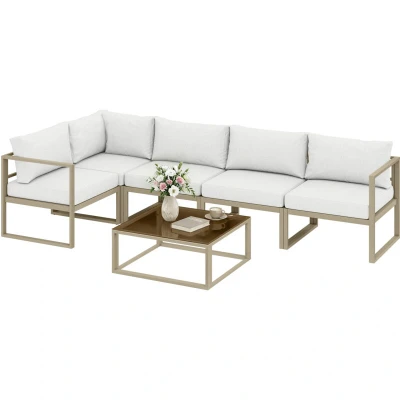 Modular 6-piece aet: This garden furniture set includes 1 corner, 2 middle, 2 side chairs and 1 coffee table. You can mix and match the pieces to form an L-shaped sofa, a lounge, or separate seats, creating a layout that fits your garden and gatherings Lightweight aluminium frame: Crafted with a powder-coated aluminium frame, this patio furniture is easy to move while offering strong rust and weather resistance. Each seat supports up to 160 kg, providing reliable outdoor use, even in changeable weather Deep comfortable seating: Enjoy 65 cm deep seats that let you sink in and relax, with thick seat and back cushions all filled with high-density 1800 g/㎡ padding, providing both firm support and cosy comfort for lounging on this garden sofa set Easy-care cushions: The cushions in this outdoor furniture set are made with 180 g/㎡ waterproof polyester fabric that resists UV rays and fading. All zipped covers are removable and washable, making maintenance simple and stress-free Tempered glass table: The coffee table in this patio set has a 5 mm tempered glass top that's easy to clean and maintain, great for holding drinks, snacks, books, or other outdoor essentials while you relax in your garden