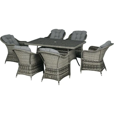 Bring everyone together outside, this season and beyond, with this Outsunny rattan garden furniture set. Includes six chairs and a large table - plenty of space for your favourite company. Each piece is made from powder coated aluminium for a strong core, wrapped in durable and stylish plastic wicker - a protective rattan shell. Keep safely shaded, thanks to the parasol hole in the glass-top table. Specifications: ● Colour: Grey ● Material: PE Wicker, Aluminium, Polyester ● Dining Table Dimension: 150L x 90W x 75H cm ● Dining Chair Dimension: 62W x 77D x 82H cm ● Seat Height (without cushion): 41 cm ● Seat Size: 50W x 48D cm ● Umbrella Hole Size: Φ5 cm ● Chair Weight Capacity: 120 kg ● Table Weight Capacity: 70 kg ● Item Label: 861-037V71GY Just so you know: this item ships and arrives in separate boxes. Delivery times may vary with each box. Box quantity: 3 Features: ● Comes with six chairs and large dining table ● Sleek tempered glass tabletop for a flat and reliable surface to use