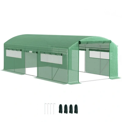 General description Year-round gardening with plenty of space and protection is made easy with the Outsunny polytunnel greenhouse. This greenhouse features three roll-up doors and multiple mesh windows, allowing for easy access and ample fresh air circulation. The structure is fitted with a 140gsm plastic cover that provides a protective shell, shielding the interior from harsh weather while allowing sunlight to penetrate for optimal plant growth. Technical specifications Colour: Green Material: 140 gsm PE, Galvanised Steel Overall Dimensions: 594L x 300W x 200H cm Front Door Dimensions: 160W x 180H cm Side Door Dimensions: 117W x 150H cm Window Dimensions: 159W x 40H cm, 47W x 40H cm Edging Width: 15 cm Windproof Level: 4 (wind speed below 17.5 mph) Recommended Assembly: 3-4 people Compatibility and accessories Includes four ground stakes Includes four guy ropes to secure the greenhouse to the ground Installation Assembly required Recommended assembly by 3-4 people