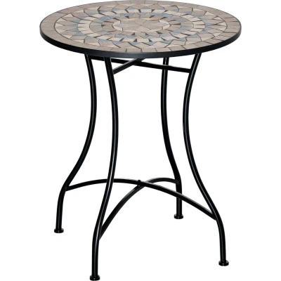 AmazonMosaic tabletop: An classic and elegant outdoor table - the vibrant mosaic design brings character into outdoor spaces. Versatile: Not just a patio table, use this indoors, as a plant stand and beyond. Metal frame: Powder coated for extra strength, this round table is a tough piece, resistant to weathering and corrosion. Curved legs and bottom crossbar adds stability. Easy to maintain: Keep your table clean with minimal effort - simply wipe with a damp cloth. Easy to keep looking fresh and beautiful. Dimensions: 71H x Φ60 cm. Maximum load 50 kg. Assembly required.