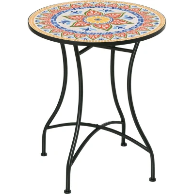AmazonMosaic tabletop: An classic and elegant outdoor table - the vibrant mosaic design brings character into outdoor spaces. Versatile: Not just a patio table, use this indoors, as a plant stand and beyond. Metal frame: Powder coated for extra strength, this round table is a tough piece, resistant to weathering and corrosion. Curved legs and bottom crossbar adds stability. Easy to maintain: Keep your table clean with minimal effort - simply wipe with a damp cloth. Easy to keep looking fresh and beautiful. Dimensions: 71H x Φ60 cm. Maximum load 50 kg. Assembly required.
