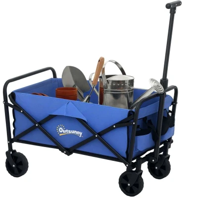 General description Discover the convenience of the Outsunny Garden Cart, a versatile trolley on wheels designed for every outdoor adventure. With a spacious 62 L cargo bag and robust 120 kg capacity, it's great as a festival trolley or camping trolley. Crafted from splash-resistant Oxford fabric and a powder-coated frame, this foldable cart is built for durability and ease. Technical specifications Colour: Blue Materials: Metal, Oxford Fabric Overall Dimensions: 76L x 48W x 60-86H cm Folded Dimensions: 62L x 47W x 15H cm Cargo Bag Size: 62L x 40W x 25H cm Telescoping Handle Length: 45-75 cm Adjustable Handle Angle: 90-180° Wheel Size: Ф12 cm Storage Bag Size: 20L x 15H cm Carry Bag Dimensions: 40L x 26W x 24H cm Weight Capacity: 120 kg Item Label: 84H-367V00BU Compatibility and accessories Includes a carrying bag for easy storage Installation Assembly required Usage Ideal for festivals, camping, and outdoor adventures Two universal wheels ensure smooth movement on all terrains