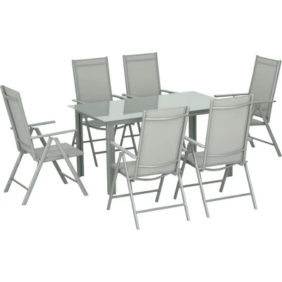 General description Whether it's for enjoying your weekend brunch, evening dinner, or catching up with friends as the evening winds down, let this garden dining set from Outsunny be the place to do it all. This great all-rounder is perfect for summer days and nights. Technical specifications Colour: Grey Material: Aluminium, Texteline, Tempered Glass Table Dimension: 150L x 90W x 74H cm Chair Dimension: 54W x 66D x 108H cm Seat Size: 44W x 45D cm Seat to Floor Height: 43 cm Chair Folding Size: 87L x 55.5W x 17H cm Weight Capacity: 50 kg (Table), 130 kg (Chair) Item Label: 84G-100V00GY Box quantity: 3 Compatibility and accessories Classically-styled outdoor set formed of six chairs and a matching rectangular table Installation Assembly required Usage Chairs feature high backs with adjustable positions (five different positions) Breathable and comfortable texteline fabric on each chair Foldable chairs are lightweight, easy to move and store Dining table with adjustable foot pads for