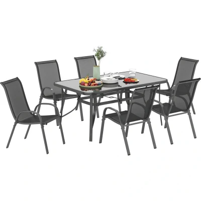 Check out this Outsunny outdoor dining set to complete your space. The set includes six garden dining chairs and a round glass-top table with an umbrella hole - you've got everything you need to dine with family/friends and keep protected. The metal frames of each piece are strong and rust-resistant, with the breathable mesh chairs making them suitable for hotter climes. An excellent addition to your outdoor areas all year round. Specifications: ● Colour: Charcoal Grey ● Material: Metal, Tempered Glass, Mesh ● Table Dimension: 150L x 90W x 71H cm ● Chair Dimension: 54W x 71D x 93H cm ● Seat Size: 44.5W x 45D cm ● Seat to Floor Height: 43 cm ● Back Size: 58L x 44.5W cm ● Back to Floor Height: 93 cm ● Parasol Hole Size: Ф51 mm ● Weight Capacity: 120 kg (chair), 50 kg (table) ● Item Label: 84B-921V02CG Just so you know: this item ships and arrives in separate boxes. Delivery times may vary with each box. Box quantity: 2 Features: ● 7-piece set, includes 6 armchairs and1 matching table ●