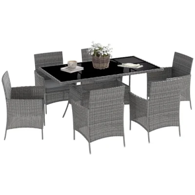 Outsunny 7 Piece Rattan Garden Furniture Set with Cushions, 6 Seater Table and Chairs, Dining Armchairs, Rectangular Glass Top Table, Charcoal Grey