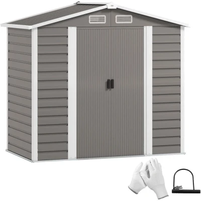 Outsunny 7 x 4ft Garden Shed, Easy to Assemble, Upgraded Galvanised Steel Frame with Foundation Kit, Double Doors Lock, Outdoor Metal Shed Vents and Gloves, Storage Light Grey