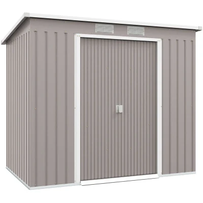 Outsunny 7 x 4ft Lean to Garden Metal Storage Shed w/ Foundation Double Door Ventilation Window Sloped Roof Outdoor Equipment Tool Storage, Grey