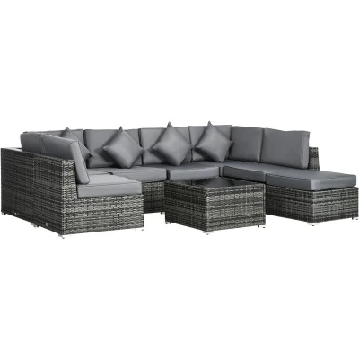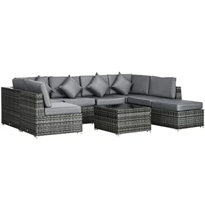 Outsunny 8 Pieces PE Rattan Corner Sofa Set, Outdoor Garden Furniture Patio Wicker Seater w/Cushion, Washable Cushion Cover & Tempered Glass Table, Grey