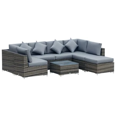 ManoManoGeneral description Make your garden stand out like never before with this beautiful outdoor corner sofa from Outsunny. This eight-piece set includes two corner seats, four normal seats, a footstool, and a table, all designed to provide comfort and style for your outdoor space. Technical specifications Item Name: Eight-piece Rattan Furniture Set Brand Name: Outsunny Material Used: PE rattan, Aluminium frame, Tempered glass Colour: Grey 2 x Corner Seat Dimensions: 78W x 78D x 65H cm 4 x Middle Seat Dimensions: 63W x 78D x 65H cm Table Dimensions: 63L x 63W x 32H cm Footstool Dimensions: 63L x 63W x 32H cm 4 x Pillow Dimensions: 40 cm x 40 cm Maximum weight per seat: 160 kg Box quantity: 3 Usage Outdoor dining set suitable for gardens, patios, and balconies. Easy to clean: simply wipe with a damp cloth. Other information No assembly required. Adjustable foot pads for balance and protection to the floor beneath. Thick grey seat and back cushions provide comfort. Durable and tough against