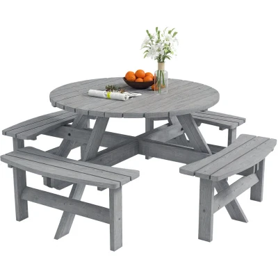 Tired of wobbly chairs and unpredictable weather spoiling your garden gatherings? The frustration of cutting conversations short is real. This Outsunny garden dining set solves that with its robust, all-in-one design. Made from solid fir wood for secure seating, it fosters intimate chats. The central parasol hole means you're always ready for sun or showers, letting you create lasting memories without interruption in your own cosy pub-garden setting. Specifications: ● Colour: Grey ● Material: Fir Wood ● Overall Dimension: Ф178 x 70H cm ● Table Size: Ф110 x 70H cm ● Bench Size: 90L x 25W x 42H cm ● Parasol Hole Diameter: 5 cm ● Weight Capacity: 227 kg (bench), 227 kg (table) ● Item Label: 84B-192V00GY Just so you know: this item ships and arrives in separate boxes. Delivery times may vary with each box. Box quantity: 2 Features: ● Large 110cm tabletop and 90cm benches offer generous space for everyone ● All-in-one design with four benches creates an intimate social hub safely ● Made