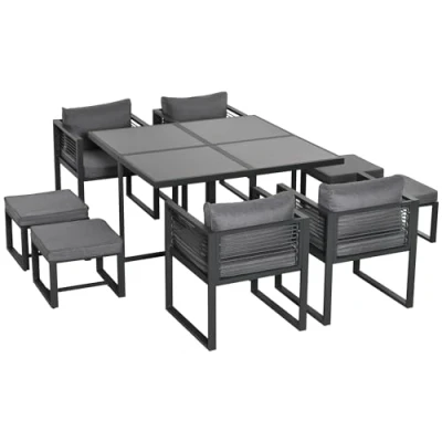 Outsunny 9 Pieces Garden Dining Set with Cushion, 8 Seater Table and Chairs Cube Glass Top Table, 4 Footstools, Grey