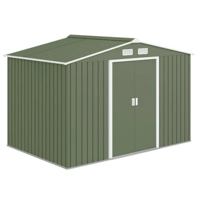ManoManoGeneral description Keep your garden equipment and outdoor essentials locked away securely with this Outsunny metal garden shed. Built from galvanised steel for strength, it features a lockable double sliding door for easy access and four vents to promote air circulation and prevent moisture buildup. The shed is finished with a protective weather coating and includes a foundation kit to ensure it stands level on the ground. Technical specifications Colour: Light Green Material: Galvanised Steel Overall Dimension: 277L x 195W x 192H cm Room Interior Dimension: 267L x 181W cm Sliding Door Size: 96L x 152H cm Vents Size: 20L x 10W cm Item Label: 845-031YG Installation Assembly required Three people are recommended for installation Estimated installation time: approximately four hours Always wear gloves during assembly Do not build during windy weather conditions Usage Spacious enough for storing outdoor tools, equipment, and gardening gear Sliding and lockable double door allows for easy