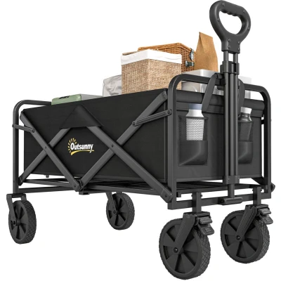 Outsunny 90L Folding Garden Trolley Cart Pull Along Wagon with Telescopic Handle for Beach Camping Festival Black