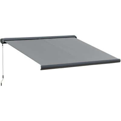 General description Provide cover for yourself outdoors in an instant with this electric awning from Outsunny. The frame is made from a blend of aluminium and steel, ensuring it is strong and reliable for use outdoors in all weather. The patio canopy features a PVC coating on the top, helping to protect you from UV and sun glare without fading the colour, allowing it to be used all year-round. An LED strip on the supporting arms provides a soft and beautiful glow at night. Technical specifications Colour: Grey Material: Aluminum, Steel, Polyester Fabric, LED Product Dimension: 300W x 0-250D cm Hand Crank Length: 160 cm Max Remote Control Distance: 40 m Exposed Power Cord: 5 m Rated Voltage: 230V/50Hz Rated Power: 230W Certification: CE-EMC, LVD, RoHS Custom Label: 840-222 Installation Minimum installation height: 2.5 m Attaches best to a cement wall Usage Electrically powered to open and close instantly Remote control included, with a handle also for manual operation Other information