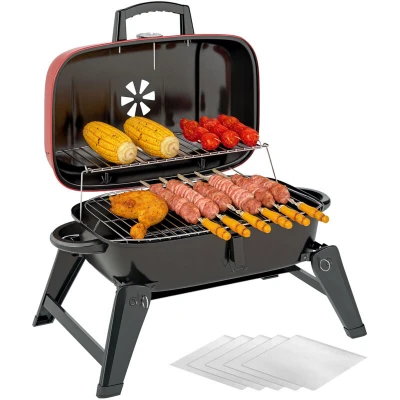 General description Fire up the fun with the Outsunny camping BBQ grill—your essential companion for sizzling, flavour-packed cookouts! With a generous 1232 cm² grilling area, it effortlessly serves your friends or family members. Take control of your BBQ experience with an adjustable vent, a built-in thermometer, and anti-scald handles, ensuring precision heat management for perfectly grilled delights every time. Get ready to grill like a pro! Technical specifications Colour: Red, Black Materials: Steel Overall Dimension: 59L x 37W x 36H cm Folding Dimension: 59L x 37W x 26H cm Grill Grate Dimension: 44L x 28W cm Warming Rack Dimension: 38L x 19W cm Charcoal Net Dimension: 36L x 21W cm Weight Capacity: grate 5 kg Aluminium Foil Dimension: 35L x 35W cm Recommended Charcoal Volume: within 50% of charcoal net area Item Label: 846-179V00RD Other information Comes with a warming rack and a 1232 cm² grill grate Foldable design with two side handles for space-saving storage and easy