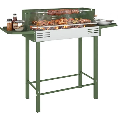 Delicious rotisserie style meat in your own home? Yes please. This open charcoal grill gives you your own spot to cook anytime in your private garden and outdoor areas. A sturdy stainless steel body, it comes with the bottom grilling area for cooking many different ingredients and a top spinning fork - perfect for chicken breasts, lamb legs and pork shoulders. Comes complete with a removable wind shield to safely protect the flames. Specifications: ● Colour: Dark Green, Silver ● Material: Stainless Steel, Metal ● Overall Dimension: 118L x 32W x 90H cm ● Charcoal Basin Dimension: 70L x 32W x 9.5H cm ● Grill Net Dimension: 68L x 32.5W cm ● Side Rack Dimension: 32L x 24W cm ● Rotisserie Kit Length: 89cm ● Windshield Dimension: 70L x 17W cm ● Weight Capacity: (side rack) 5kg, (rotisserie kit) 10kg ● Item Label: 846-075V00DG Features: ● Top rotisserie pole height is adjustable to three different levels ● Large bottom grill suitable for all other meats, vegetables, breads and more ● Two